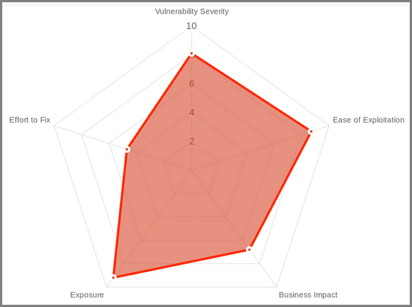 The Comprehensive Cybersecurity Risk Index (CCRI - pronounced "cry") assigns 5 metrics to each of the technical findings. Each vulnerability's CCRI score is calculated based on its Vulnerability Severity, Ease of Exploitation, Business Impact, Exposure, and Effort to Fix. All values are contextualized within the client's specific infrastructure and use a numeric scale of 1 to 10.